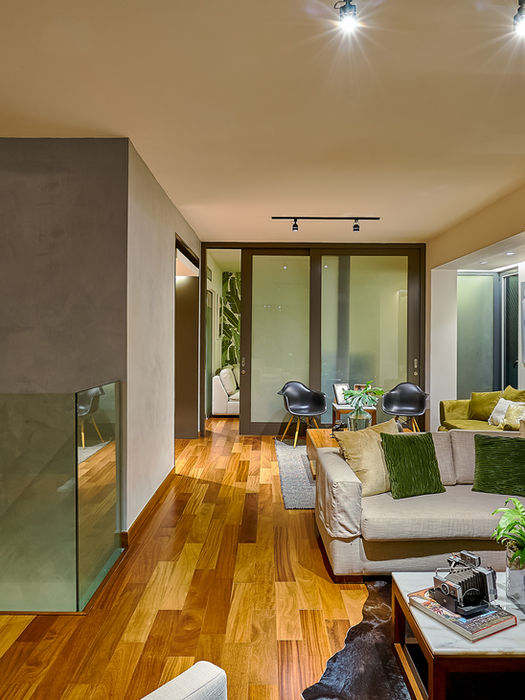 Introducing a stunning duplex apartment that showcases the perfect marriage of modern design and natural elements. The architectural project features warm wood flooring throughout, adding an organic touch to the contemporary layout. Thoughtfully designed spaces emphasize clean lines and minimalist aesthetics, creating an inviting atmosphere for comfortable living. The apartment is bathed in intimate lighting, enhancing the cozy ambiance while illuminating the tastefully curated finishes. This exquisite duplex apartment offers residents a luxurious urban sanctuary, where elegance and functionality are seamlessly combined to create a truly exceptional living experience.